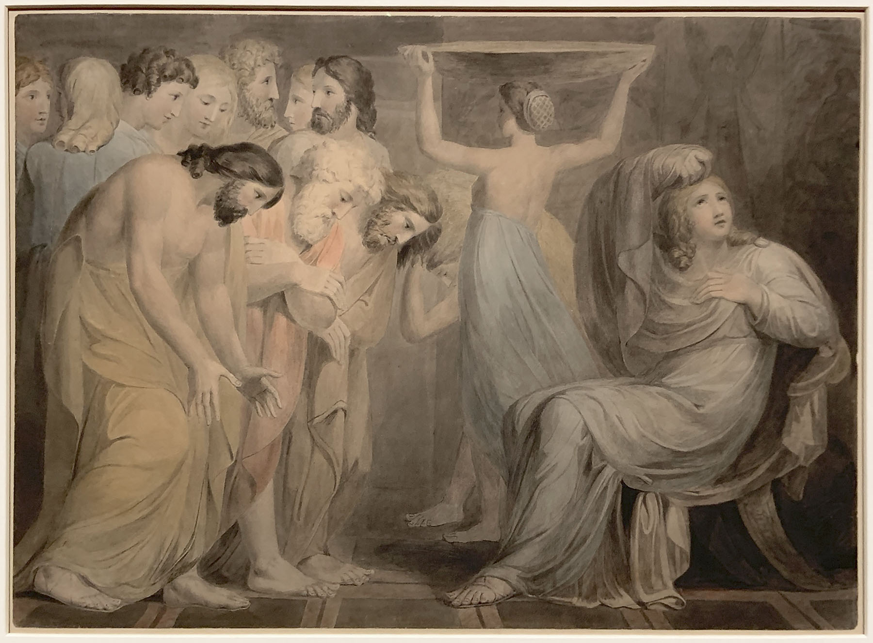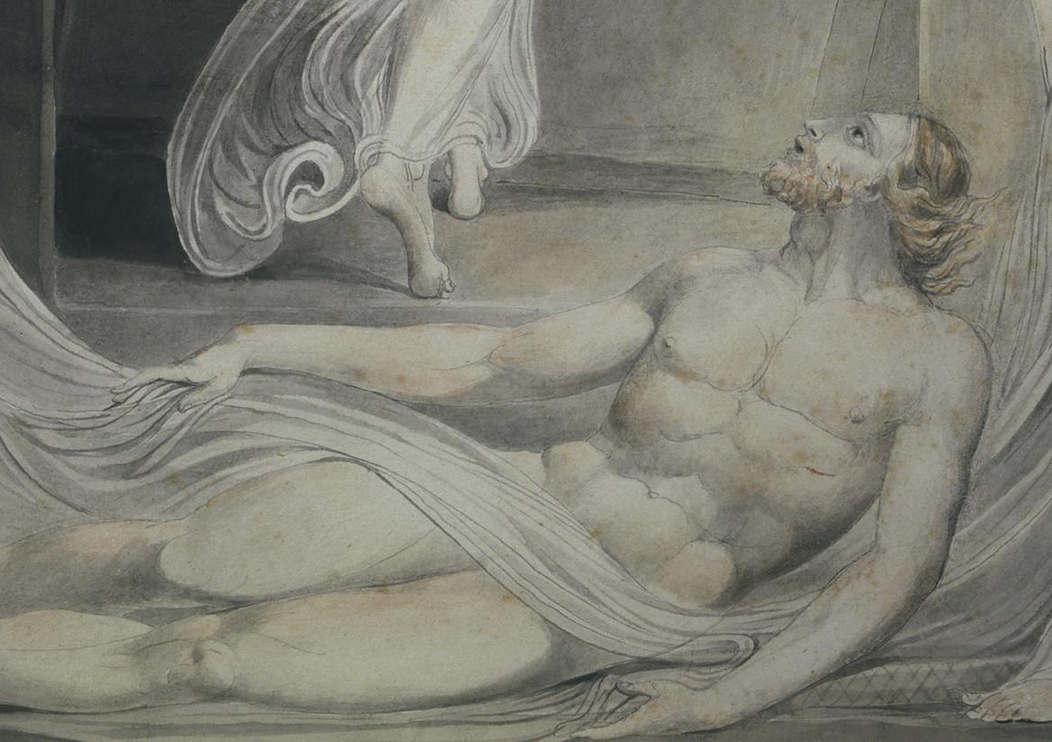 Blake’s earliest drawings typically used sweeping lines and areas of grey washed ink or watercolour. His figures make grand gestures in bare, even abstract, settings.