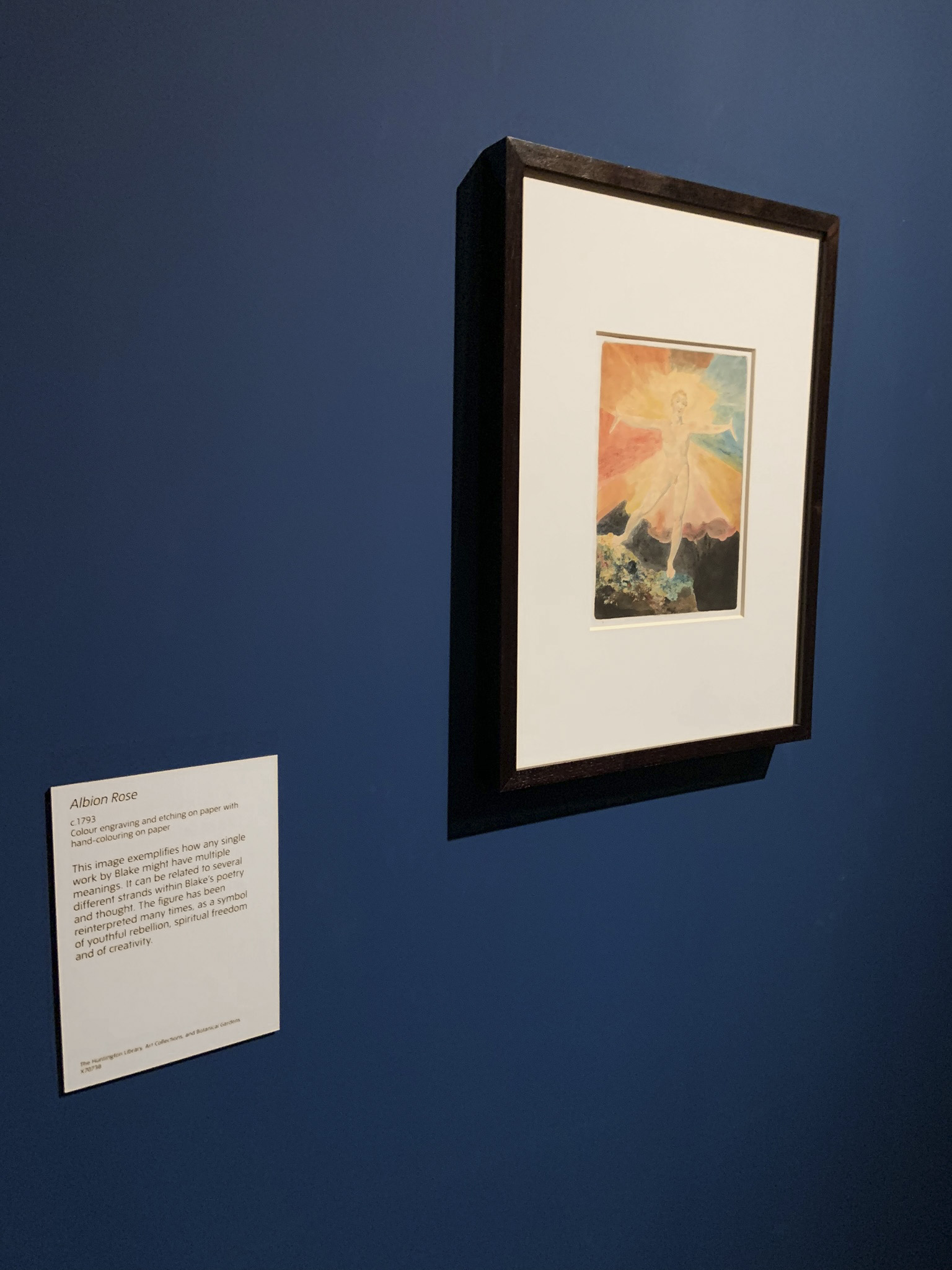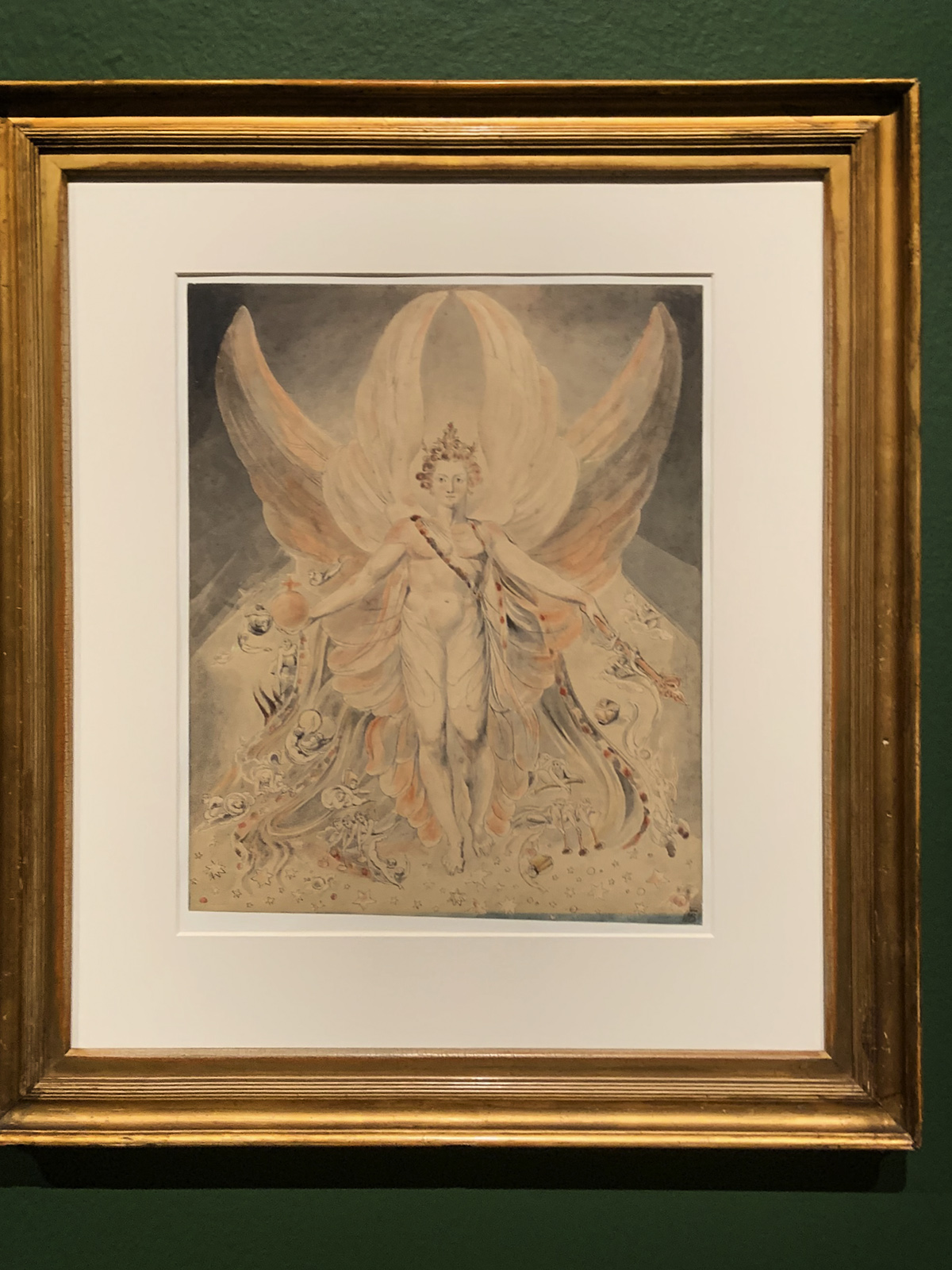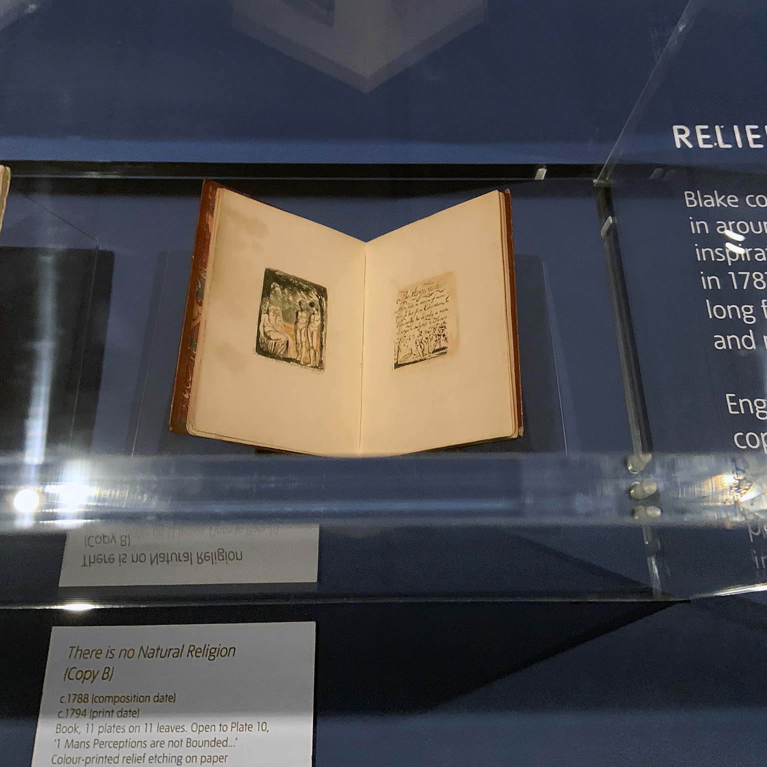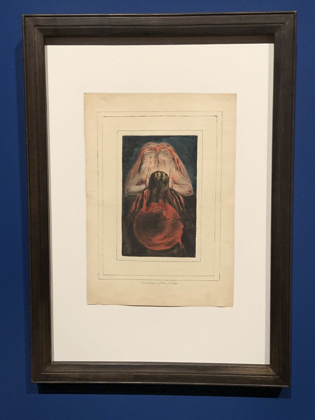 The exhibition is organised chronologically. It takes us through the ups and downs of Blake’s creative and professional life. The full range of Blake’s work is on display here. His commercial engravings, original prints, his unique ‘illuminated books’ and paintings are all included. These have been drawn from public and private collections from around the world. To preserve these rarely seen objects, the light levels across the exhibition are deliberately low.