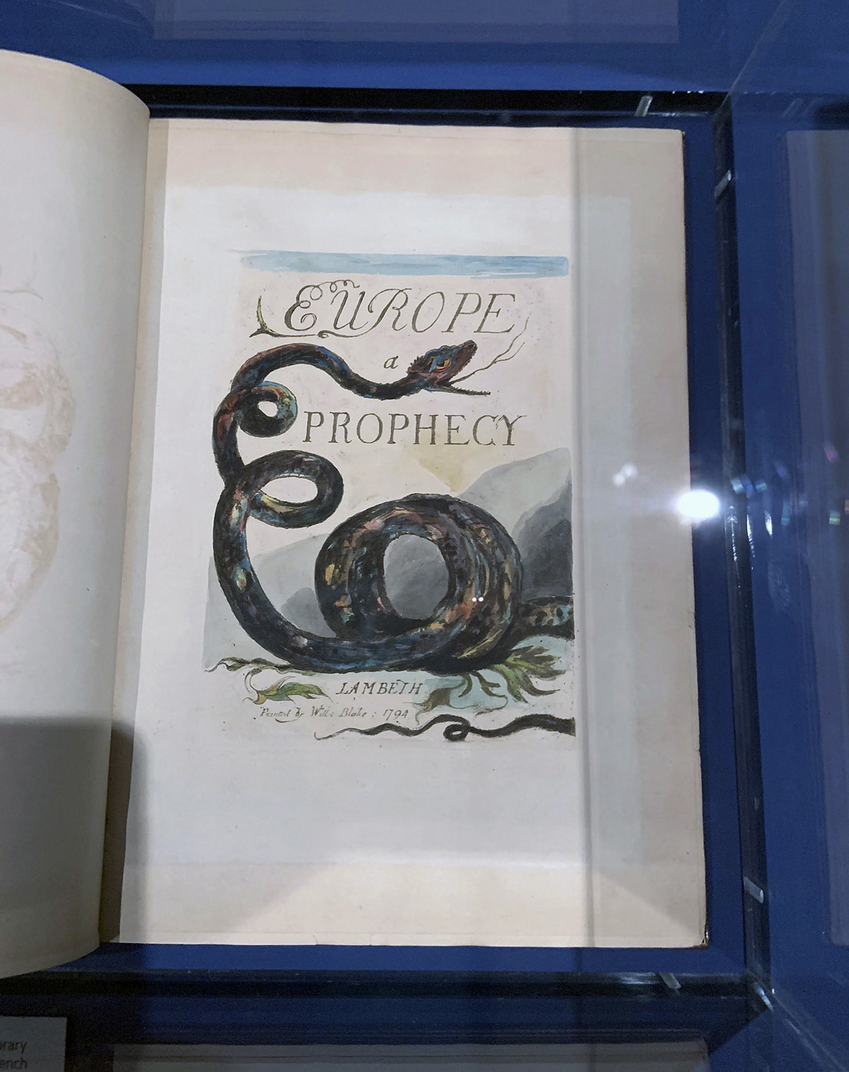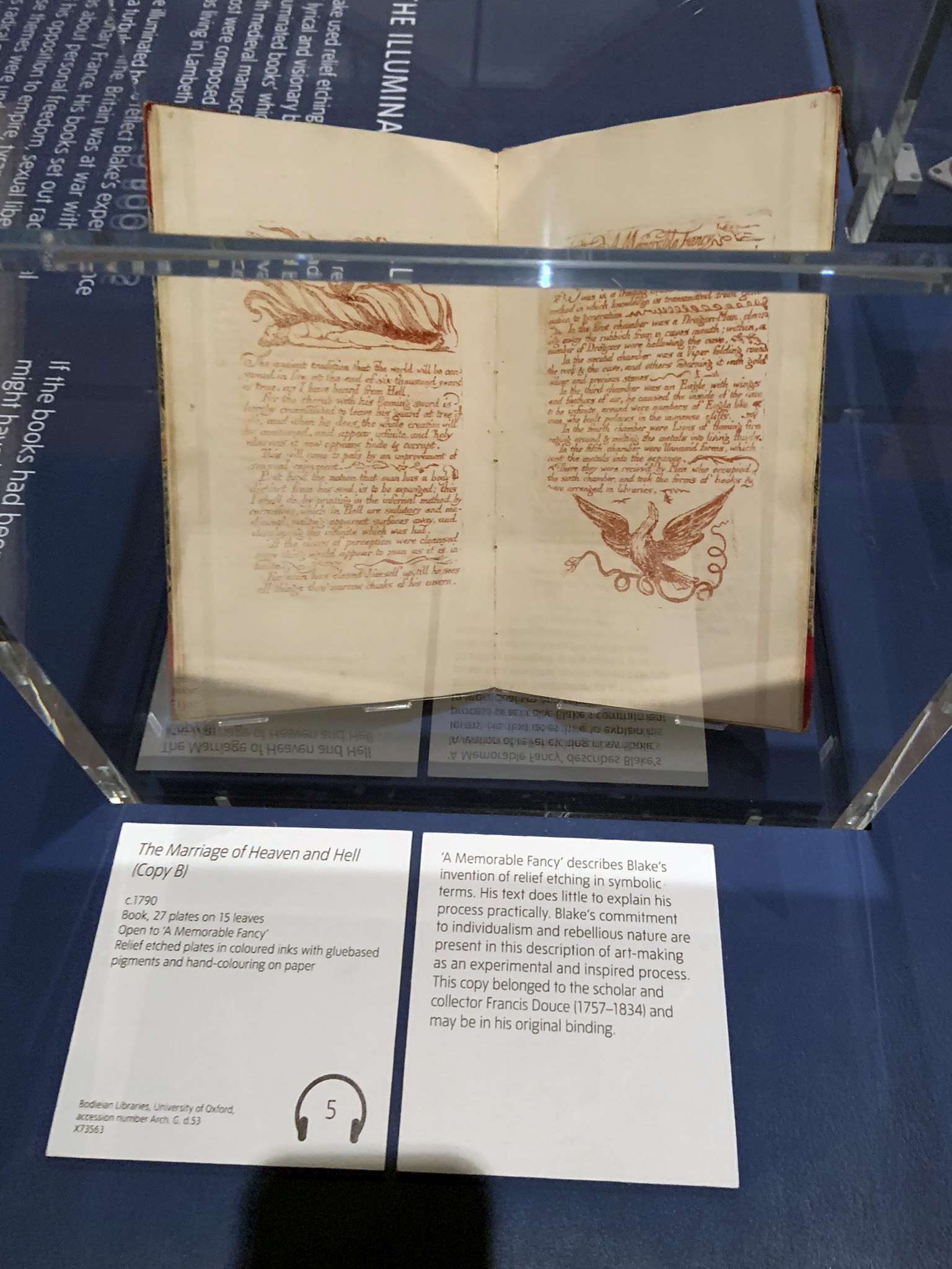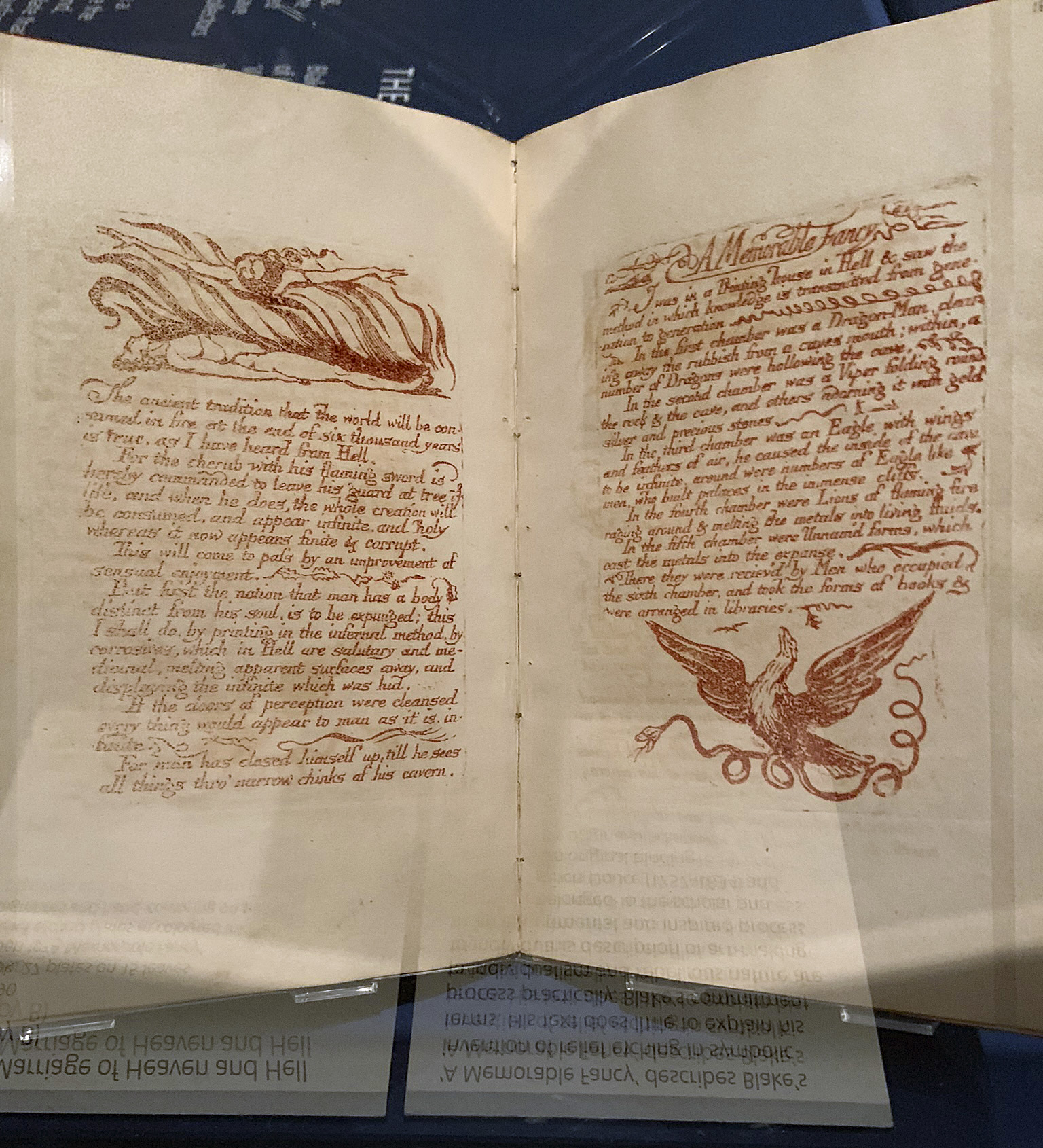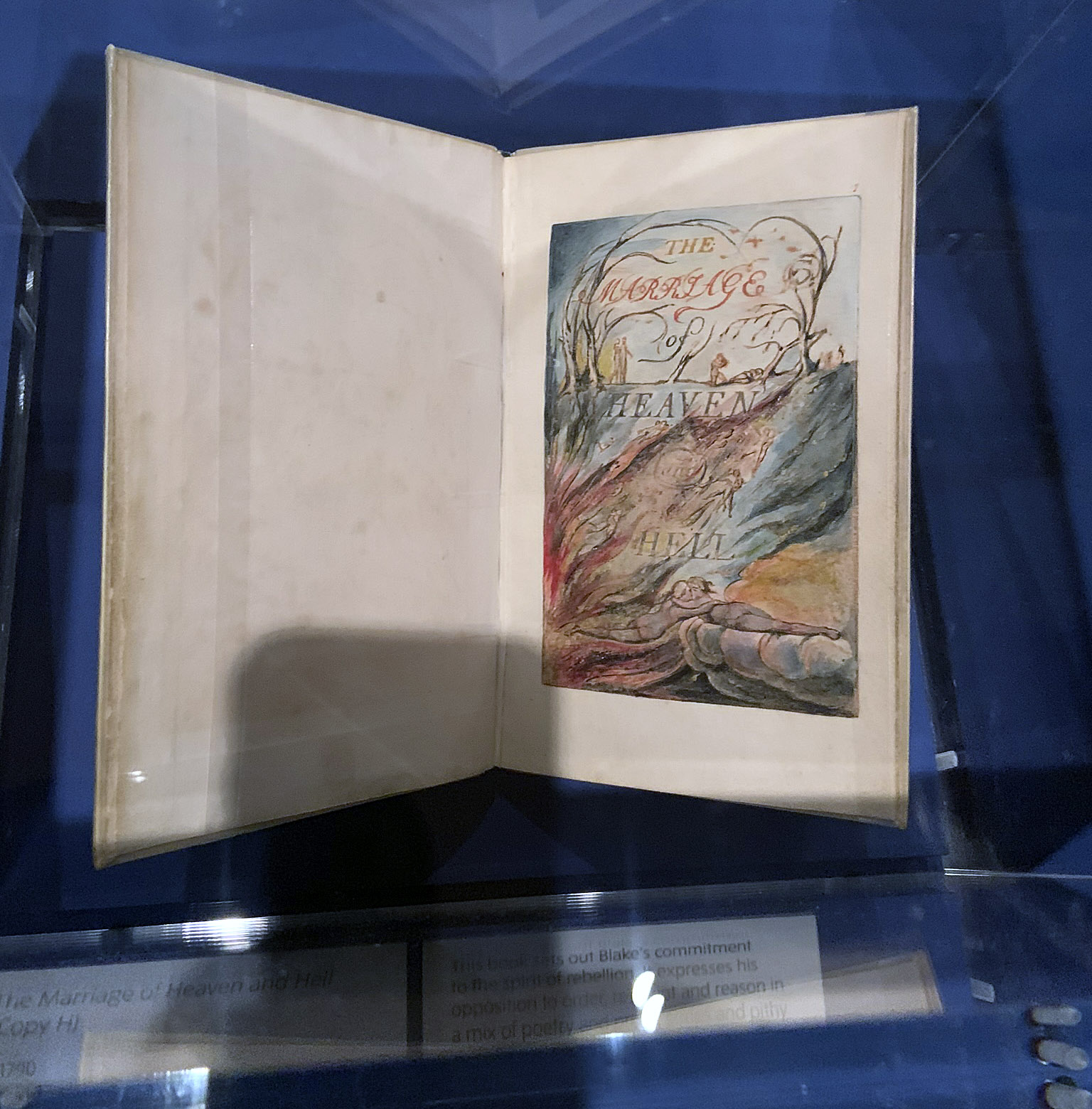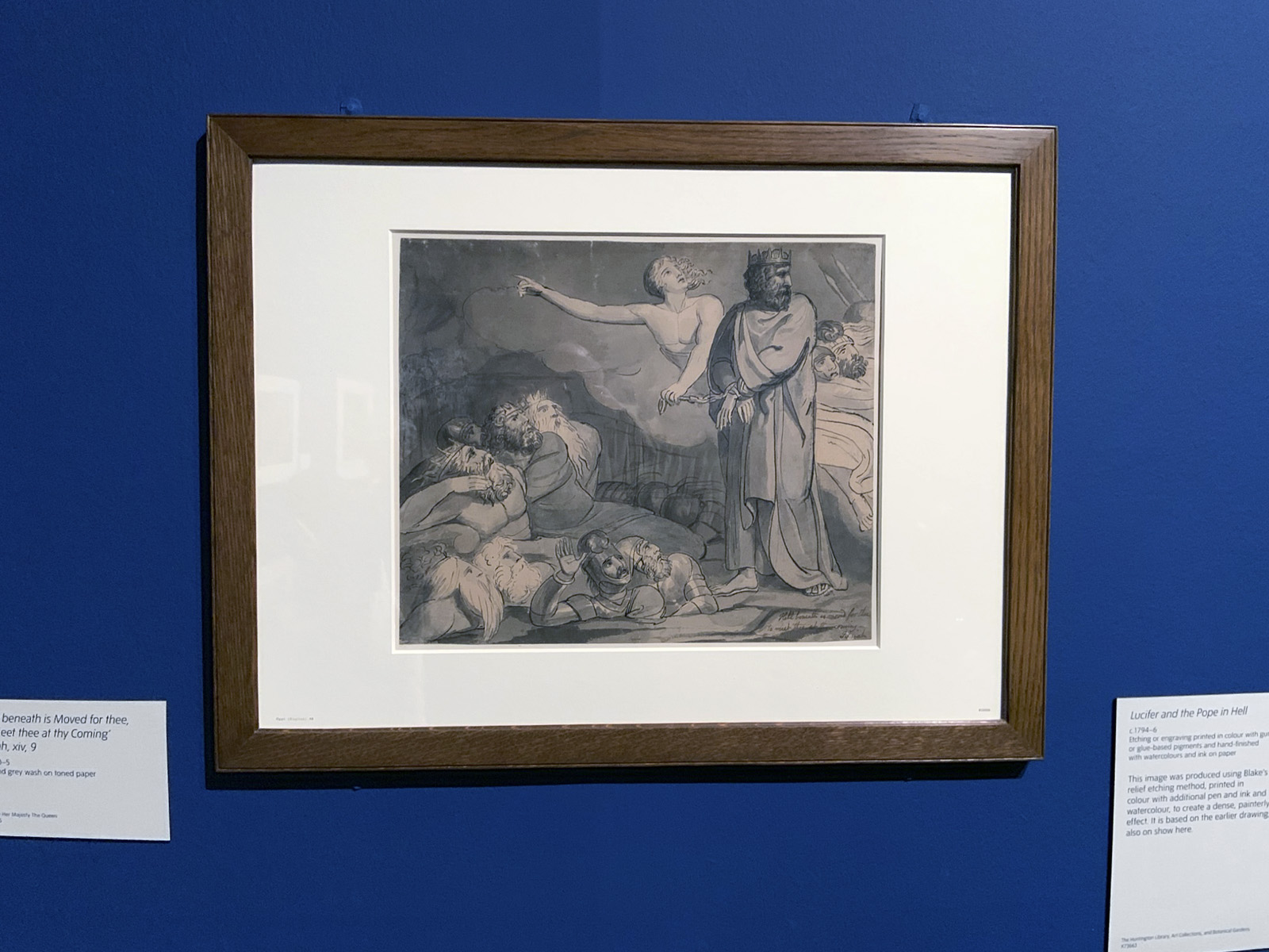 The exhibition is organised chronologically. It takes us through the ups and downs of Blake’s creative and professional life. The full range of Blake’s work is on display here. His commercial engravings, original prints, his unique ‘illuminated books’ and paintings are all included. These have been drawn from public and private collections from around the world. To preserve these rarely seen objects, the light levels across the exhibition are deliberately low.