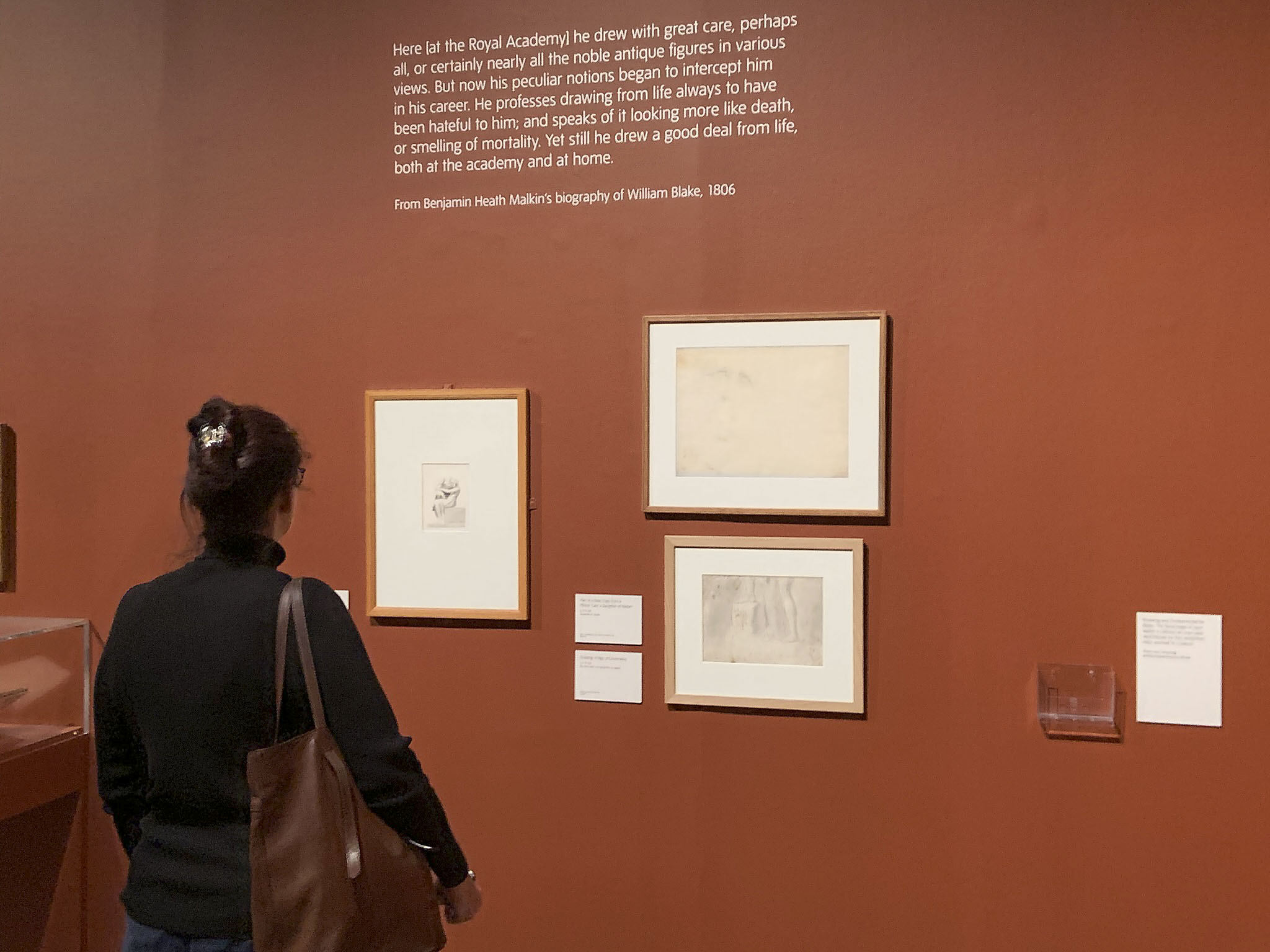 Installation view of the exhibition William Blake at Tate Britain, London with at bottom middle, Drawing of the legs of Cincinnatus (c. 1779-1780)
