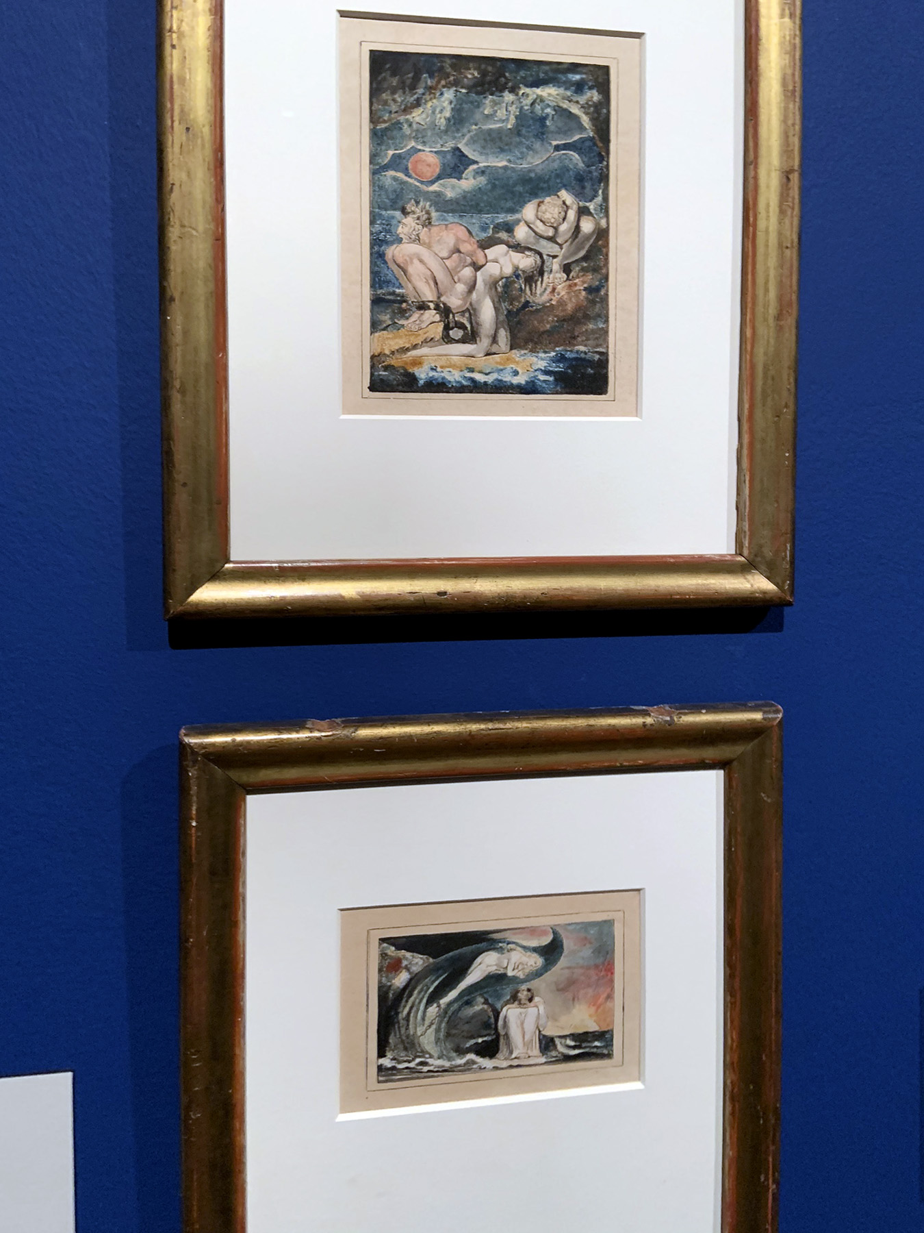 Installation view of the exhibition William Blake at Tate Britain, London showing at left, Blake’s Joseph’s Brethren Bowing down before him (1784-1785) and at right, Joseph Ordering Simeon to be Bound (1784-1785)