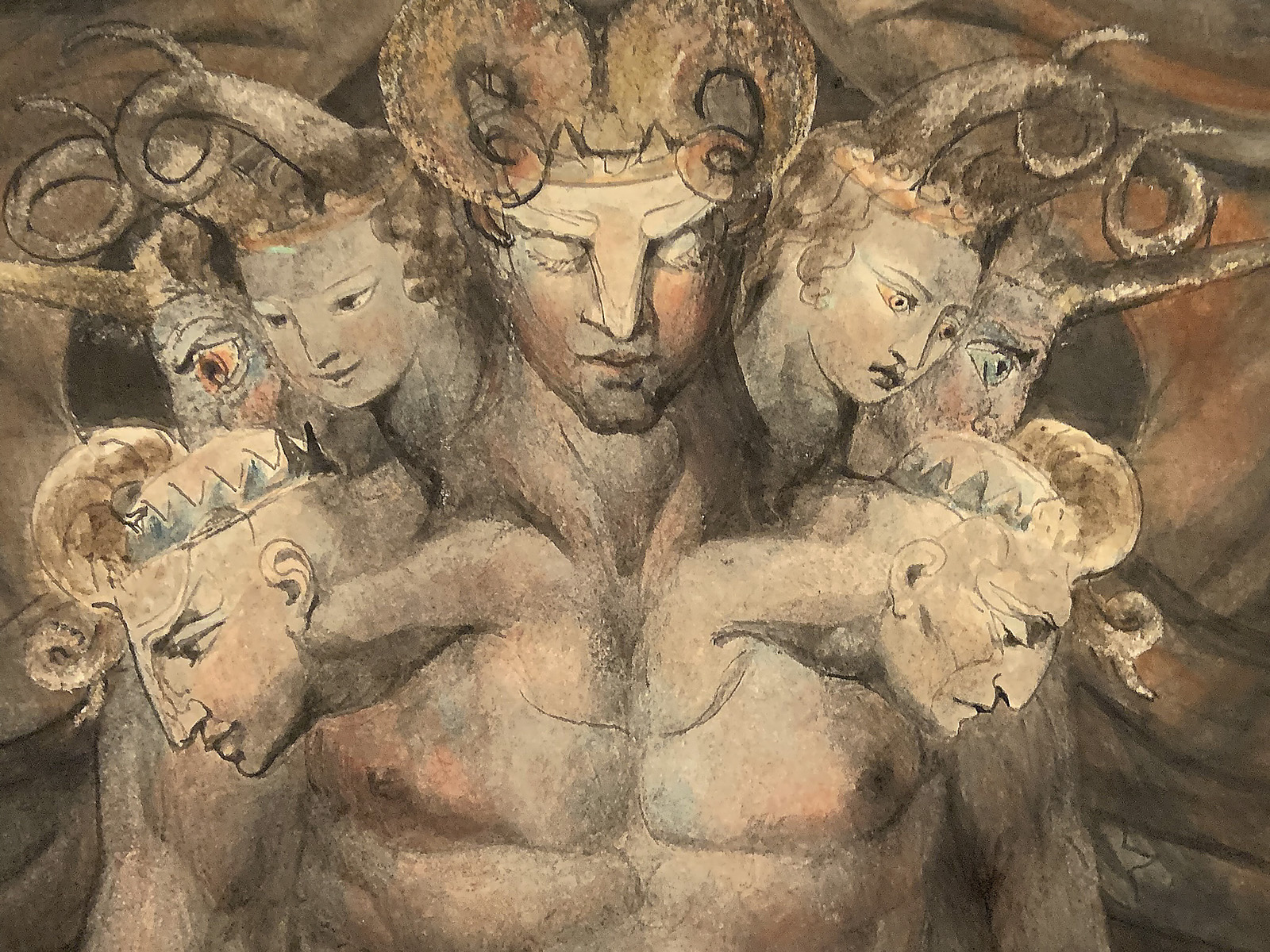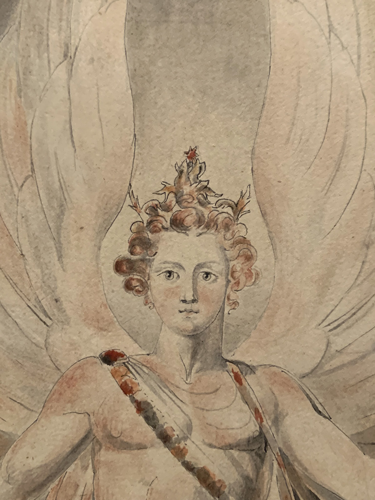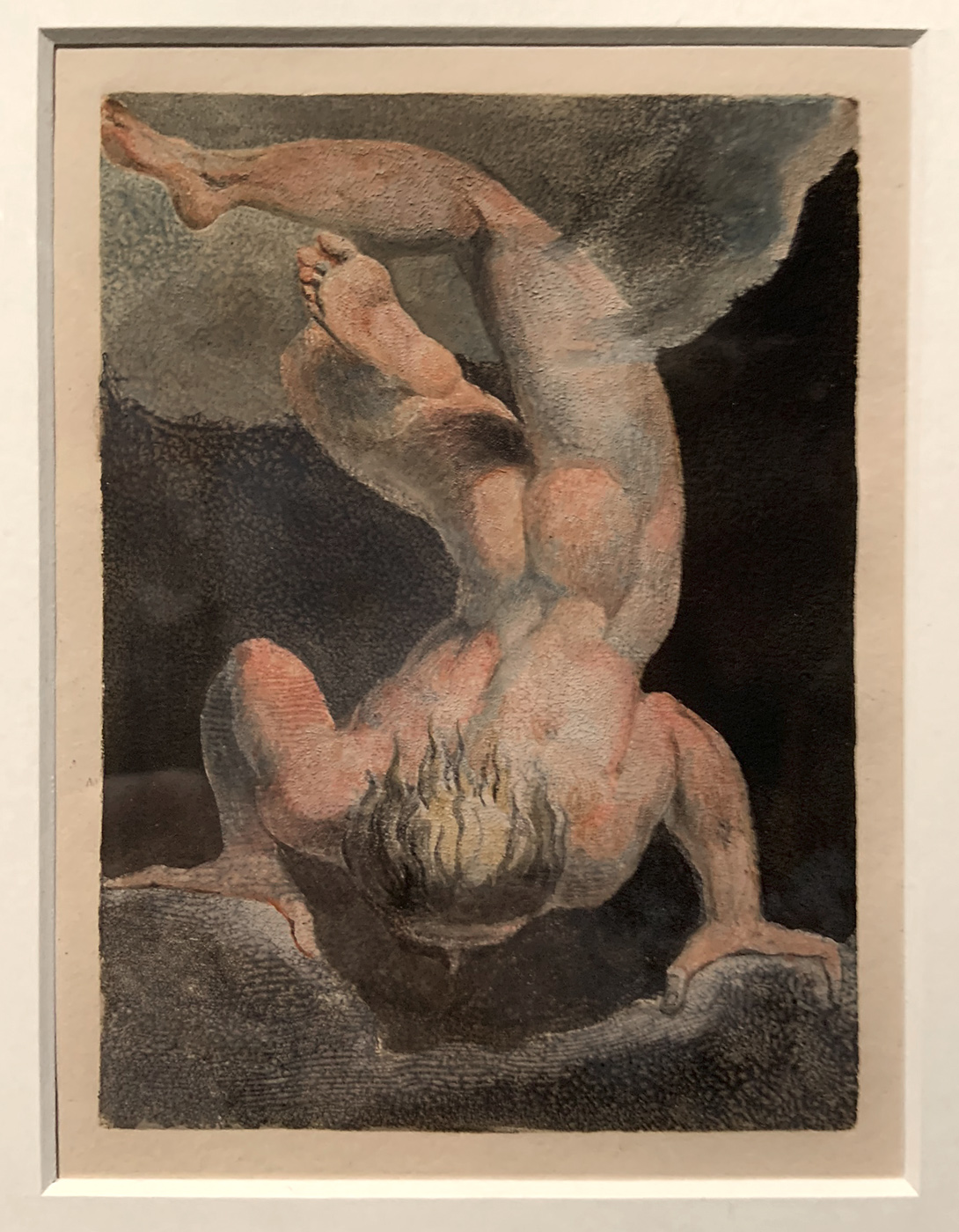 This watercolour shows Satan as he once was, a perfect part of God’s creation, before his fall from grace. His orb and sceptre symbolise his role as Prince of this World. It is also an extreme example of the damaging effects of over-exposure to light. The sky was originally an intense blue, now only visible at the lower right edge. The only colours which have survived unaltered are the vermilion red Blake used for the flesh, and red ochre in Satan’s wings. The paper has yellowed considerably. There is no evidence left of any yellow gamboge or pinkish red lakes.