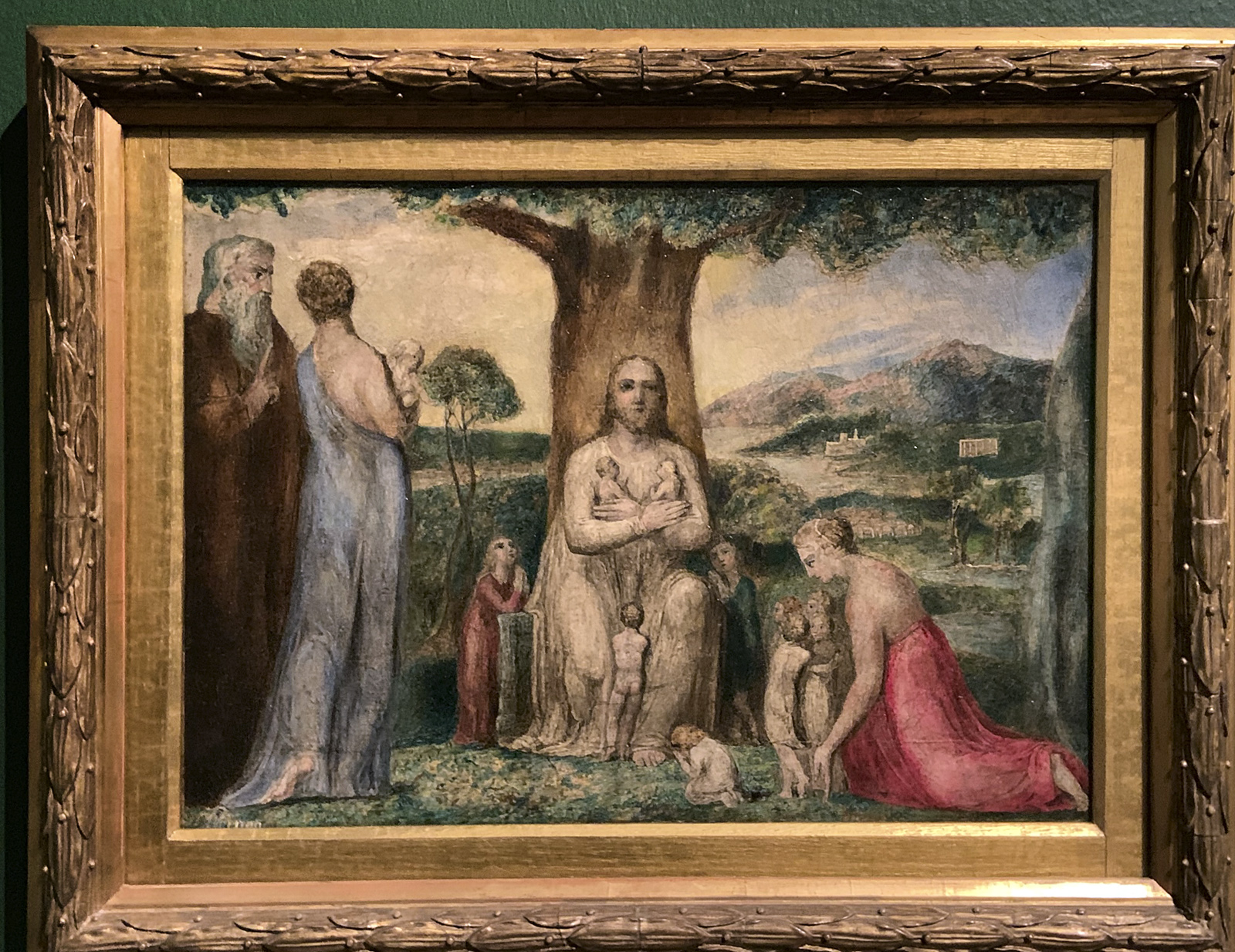 This painting is from of a group of fifty illustrations to the Bible commissioned by Blake’s patron, Thomas Butts. Its subject is taken from chapter 10 of St Mark’s Gospel. Christ, seated beneath a spreading tree, blesses children brought to him while he was preaching. To the left is one of his disciples, who tries to send the children away. Christ tells the disciples: