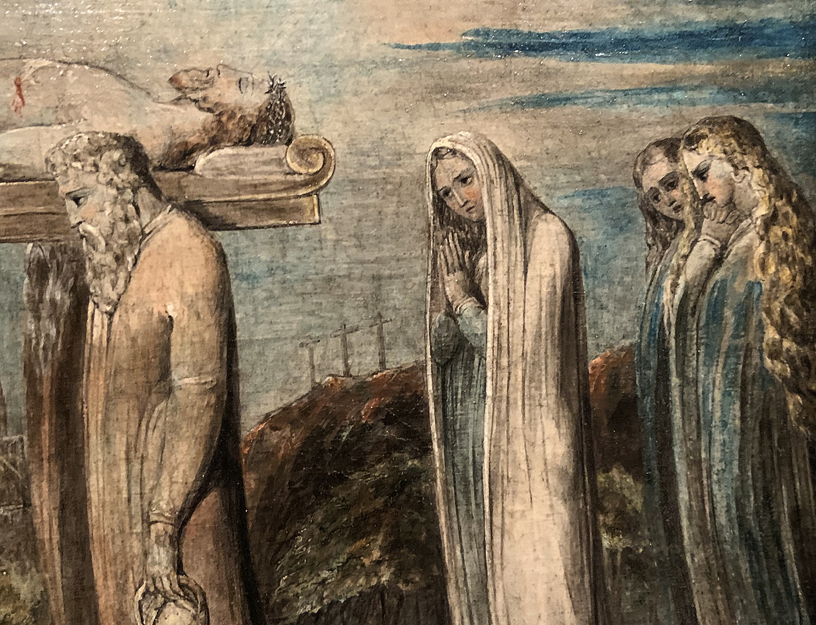 This tempera is very well preserved, mainly because it was painted on thin linen canvas, stuck onto thin cardboard. This is stiff enough to reduce the cracking that develops on flexible canvas. It also made it unnecessary to add the animal glue lining which has spoilt the opaque white effect of Blake’s chalk preparatory layer in many temperas. As a result, Blake’s delicate painted details can still be seen as he intended.