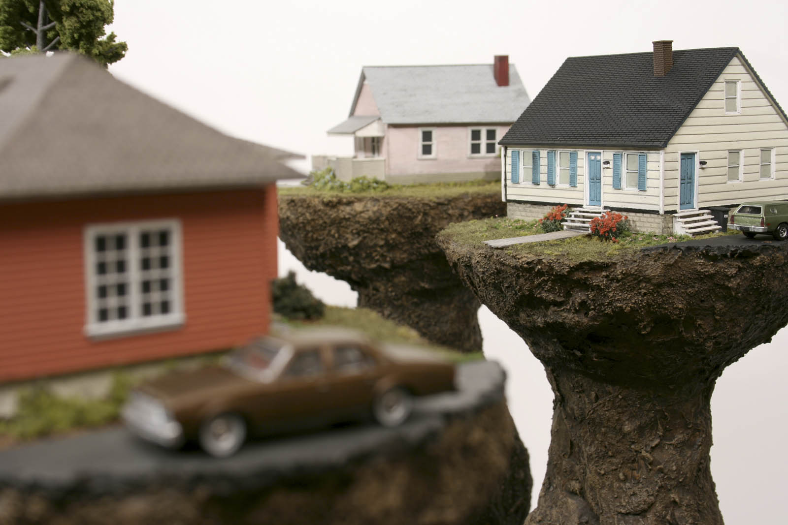Thomas Doyle work mines the debris of memory through the creation of intricate worlds sculpted in 1:43 scale and smaller. Often sealed under glass, the works depict the remnants of things past – whether major, transformational experiences, or the quieter moments that resonate loudly throughout a life. In much the way the mind recalls events through the fog of time, the works distort reality through a warped and dreamlike lens.