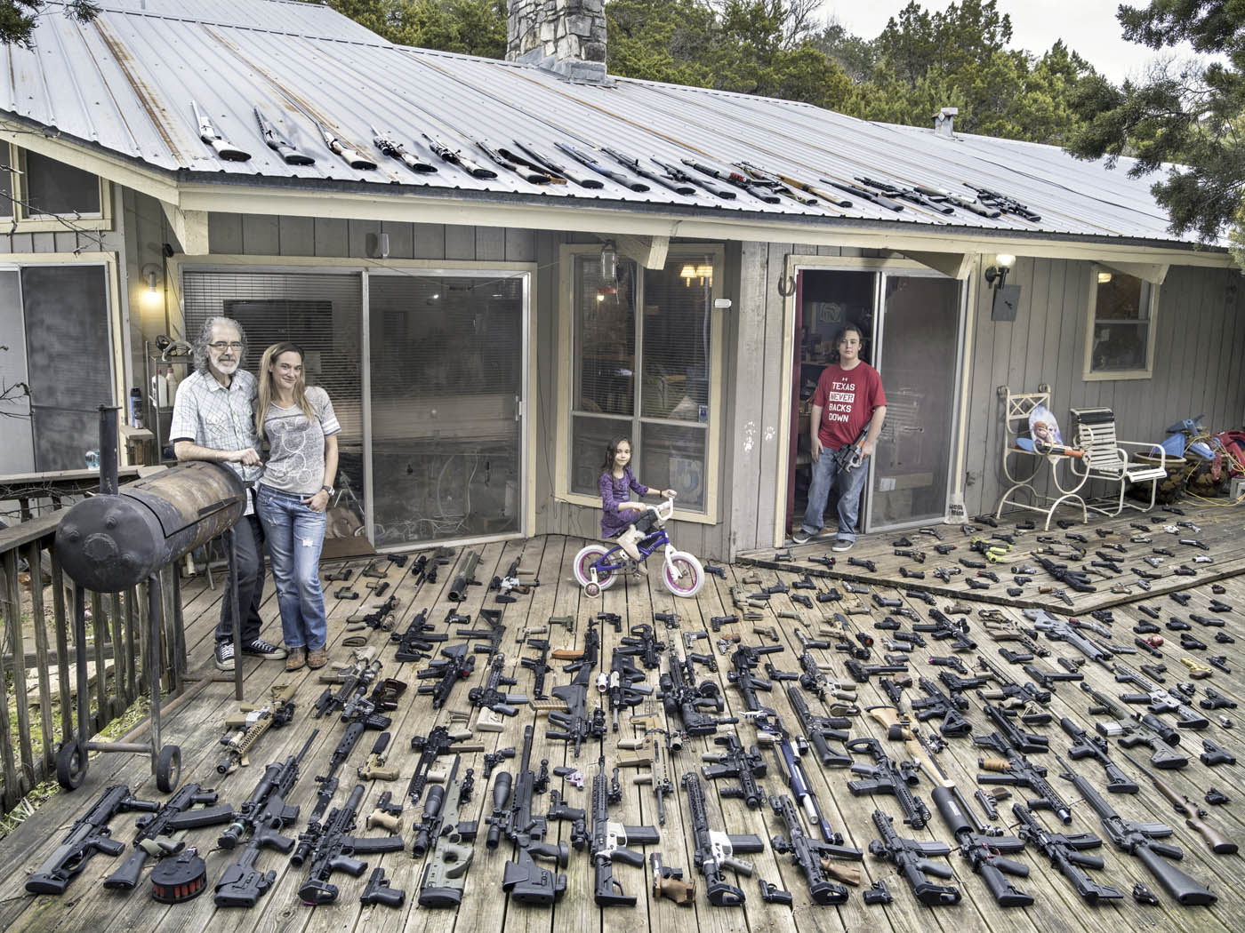 Avery Skipalis (33) stands with her firearms in front of her house in Tampa, Florida, USA. Her son looks on from a window. Avery joined the US Air Force when she was 17, and after serving in the UAE, Japan and Germany, left to start a company that offers firearms safety classes to adults and children.