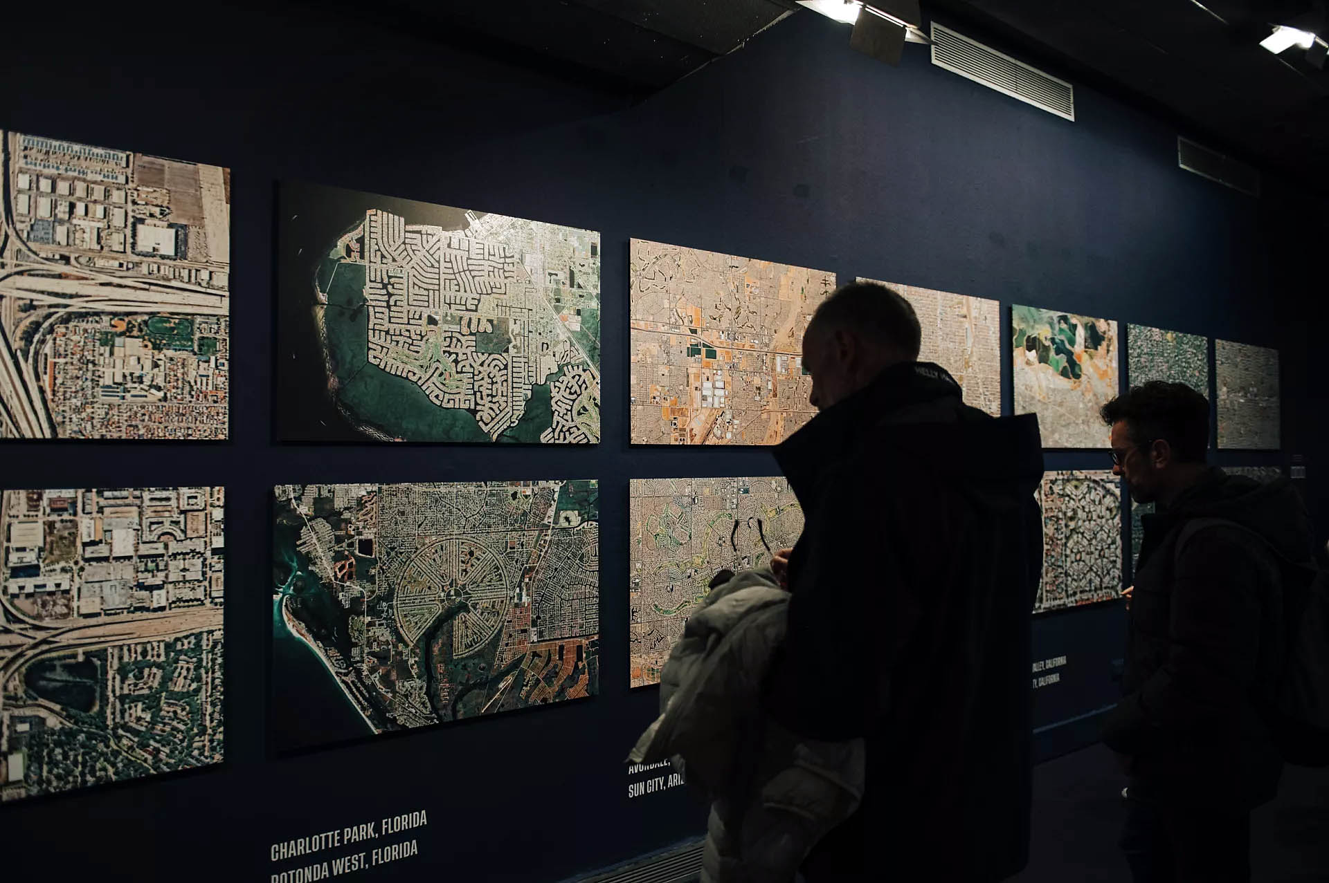 Installation views of the exhibition Suburbia. Building the American Dream at the Centre de Cultura Contemporània de Barcelona | CCCB showing in the second image photographs by Charlotte Brooks (below); and in the bottom image, visitors looking at satellite images of US cities and suburbs that show their grid layout