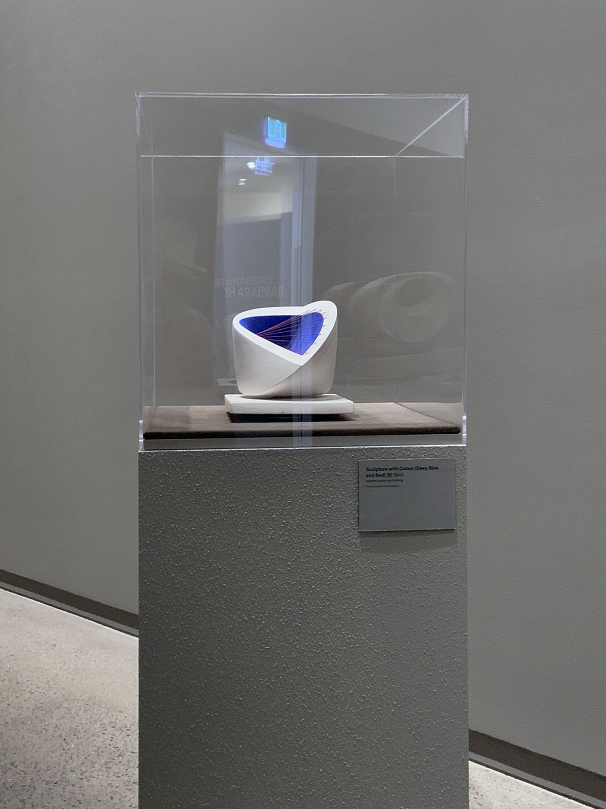 Installation view of the exhibition Barbara Hepworth: In Equilibrium at the Heide Museum of Modern Art, Melbourne showing at left Sculpture with Colour (Deep Blue and Red) [6] 1940; and at right Eidos 1947 Photo: Marcus Bunyan