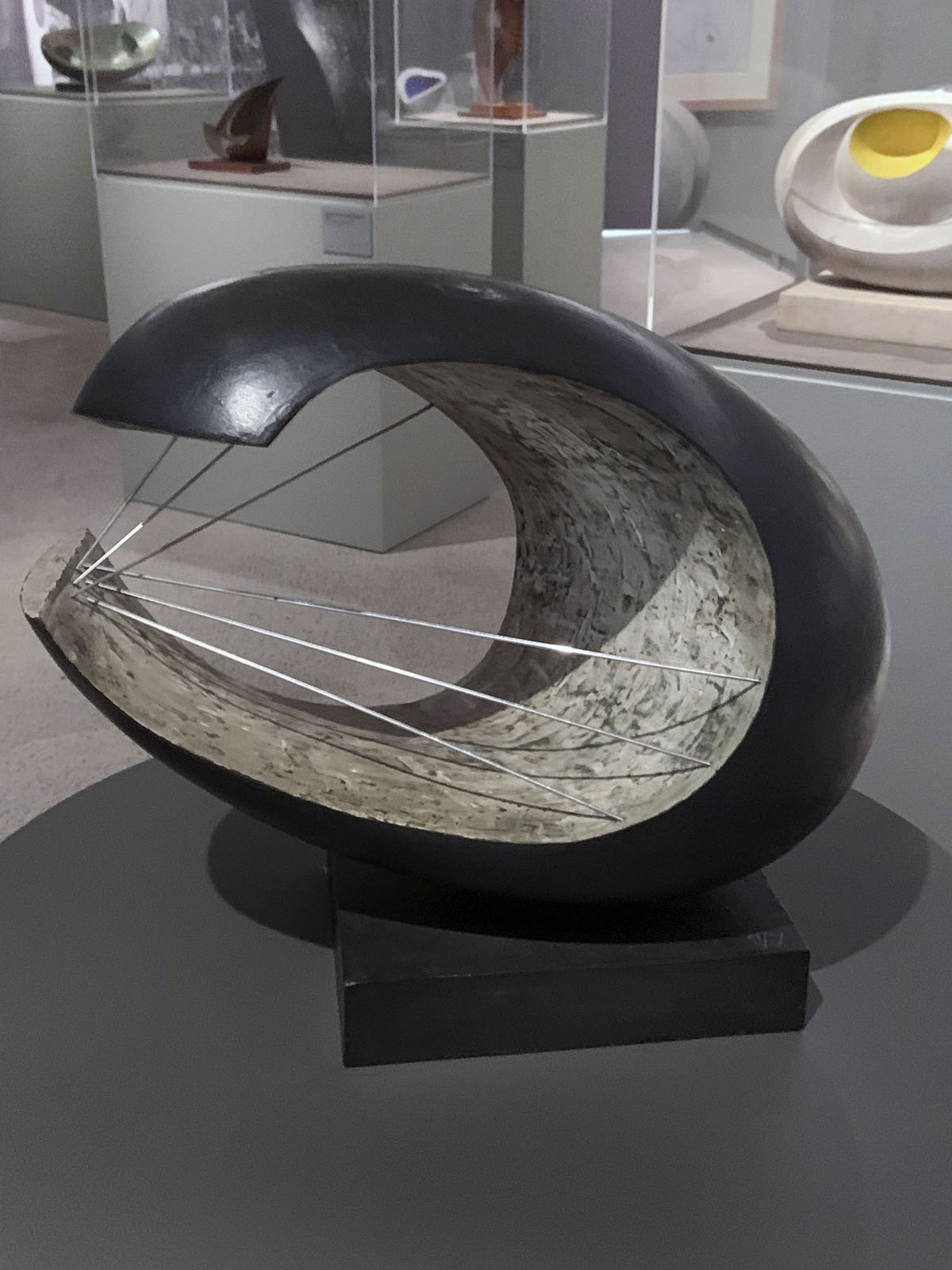 As Hepworth’s sculpture matured during the late 1930s and ’40s, she concentrated on the problem of the counterplay between mass and space. Pieces such as Wave (1943-1944) became increasingly open, hollowed out, and perforated, so that the interior space is as important as the mass surrounding it. Her practice, increasingly frequent in her mature pieces, of painting the works’ concave interiors further heightened this effect, while she accented and defined the sculptural voids by stretching strings taut across their openings.