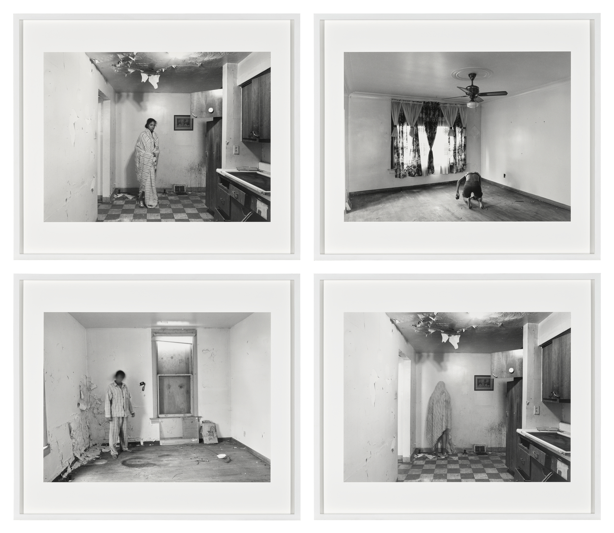 Transformations in the built environment also reveal the profound effects of the passage of time. LaToya Ruby Frazier documented the painful process of clearing the rooms of her family home in a series of self-portraits in which she cloaked herself in the familiar belongings of her loved ones. In order to spotlight socioeconomic changes in American neighbourhoods, Camilo José Vergara photographed the dramatic transformation of a single Harlem storefront over 40 years, as it changed hands, changed facades, and split into two establishments. Other artists in the exhibition, including John Divola and William Christenberry, chronicle the disintegration of architecture over time, creating evocative meditations on deterioration.